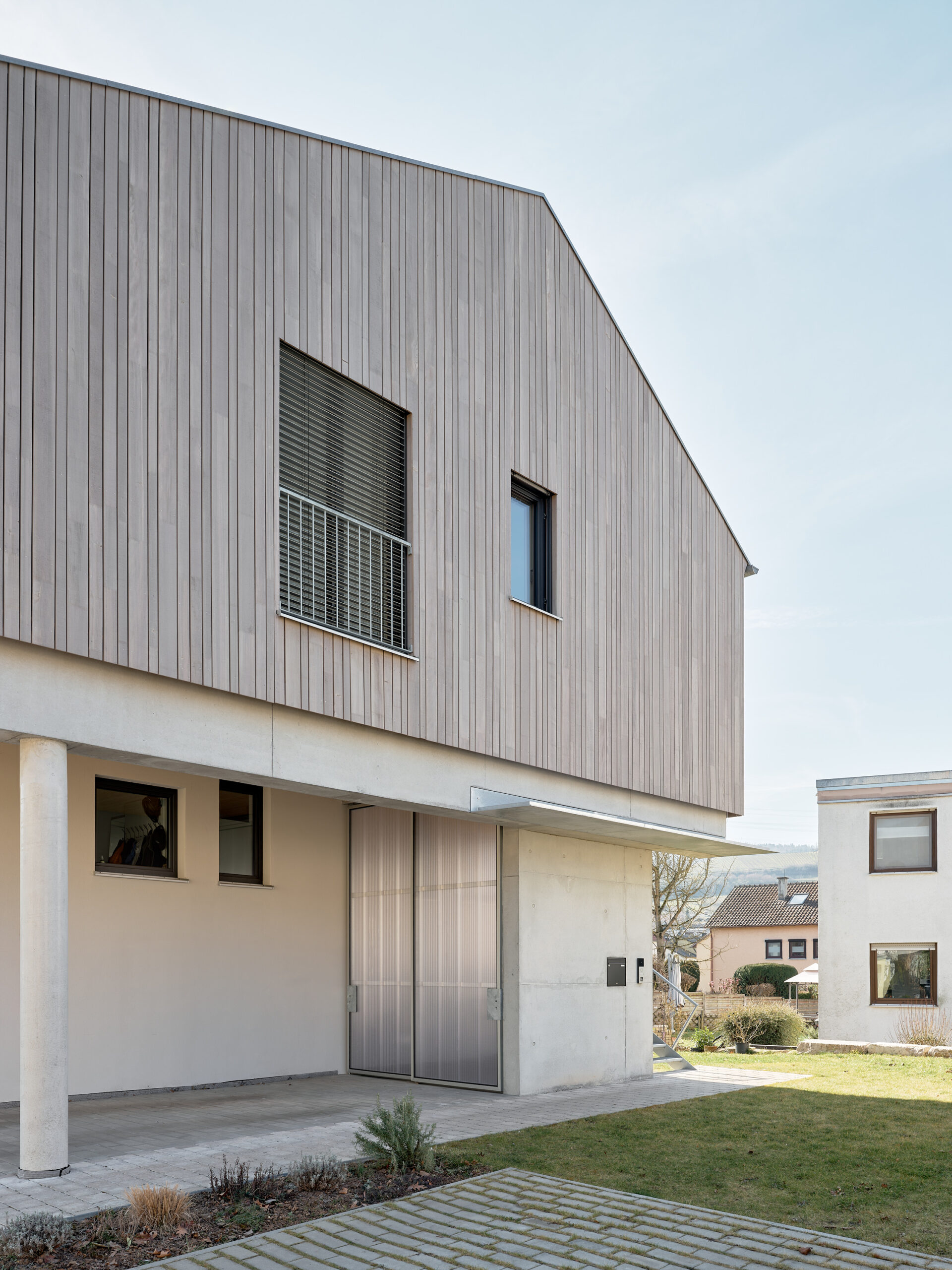 Das spärlich ausgebaute Dachgeschoss des, in den 1960er Jahren errichteten Wohnhauses erlaubte einen unkomplizierten und immerhin fast sortenreinen Rückbau bis auf die oberste Geschossdecke mit überschaubarem Aufwand. Letztere – für diesen Typ Haus eher ungewöhnlich – war bereits als massive Stahlbetondecke ausgeführt. Vor allem vor dem Hintergrund, dass dahingegen die Kellerwände noch mit einfachem Einkornbeton und die Decke darüber als Hohlkörperdecke gebaut sind. Die Neuerrichtung des Dachgeschosses in Holzbauweise nimmt dieses vorhandene Potential des Hauses dankend an und schöpft gleichzeitig das Potential des Grundstücks ebenso voll aus, indem giebelseitig eine Raumbreite hinzugefügt wird.
