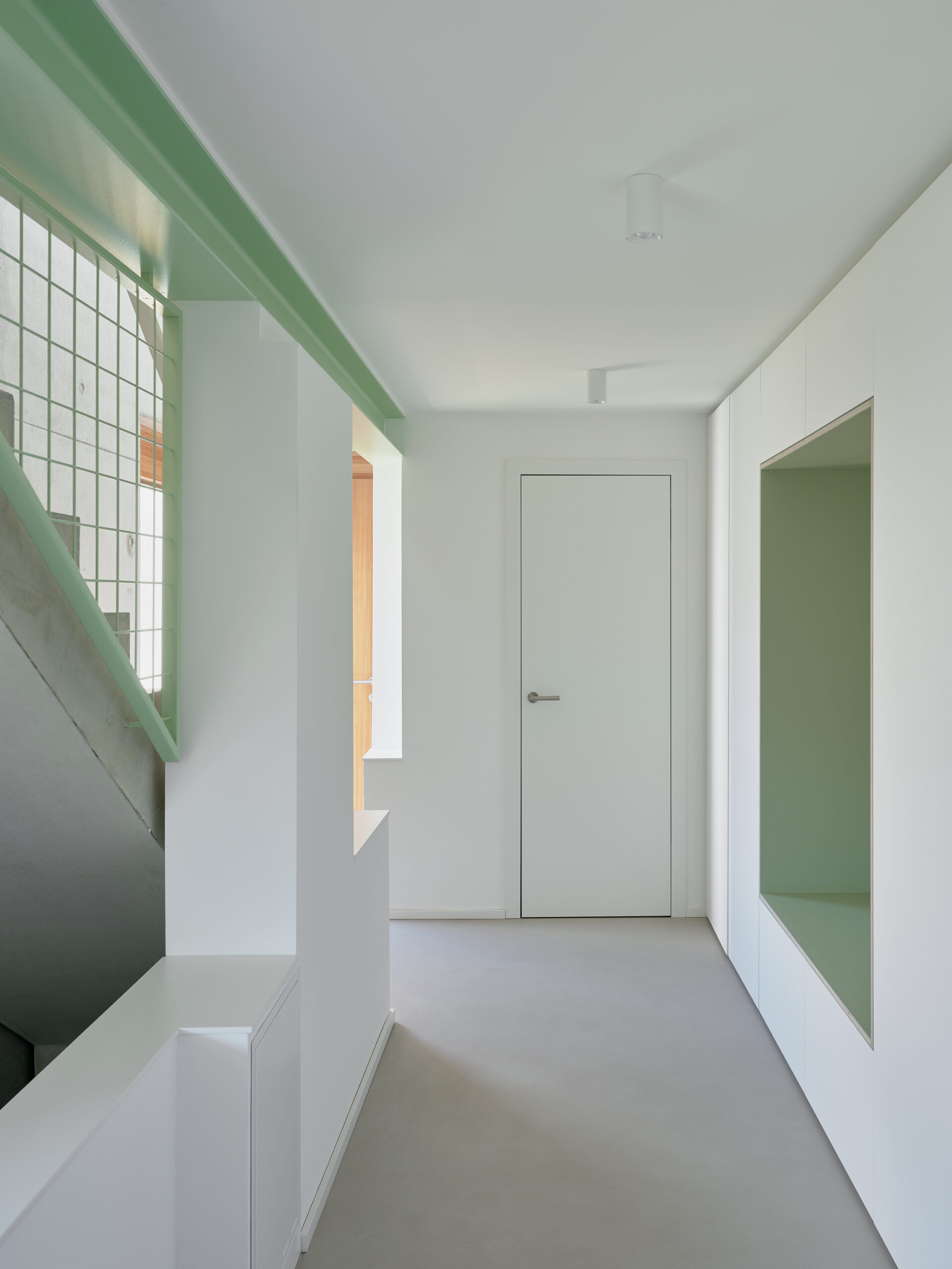 Die Wohnung im Erdgeschoss wird weiterhin über das bestehende Treppenhaus erschlossen und beginnt dadurch bereits an der Haustür (und nicht erst an der Wohnungstür).